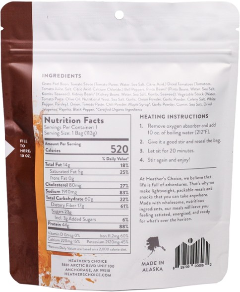 Loaded with protein and complex carbohydrates, Heather's Choice Grass-Fed Bison Chili fuels your hike with the savory goodness of bison chili seasoned with beans, tomatoes and chili spices.