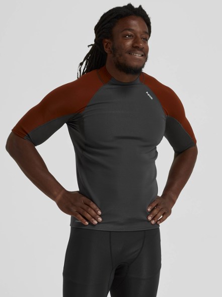 Designed to keep your core warm while still being breathable for active paddling adventures, the men's NRS HydroSkin 0.5 short-sleeve shirt is perfect for hot days in cold water.