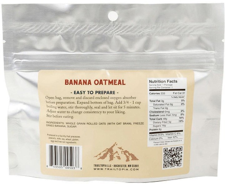 Start your day in the backcountry with the warm, power-packed flavor of Trailtopia Banana Oatmeal. Made with real banana slices, this breakfast staple can be cooked and eaten right out of the package.