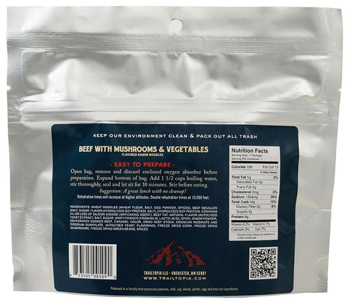 Don't settle for the ramen from the grocery. Trailtopia Ramen Noodles with Beef Flavor and Mushrooms and Vegetables offer the perfect trail lunch with beef-flavored noodles and a medley of veggies.