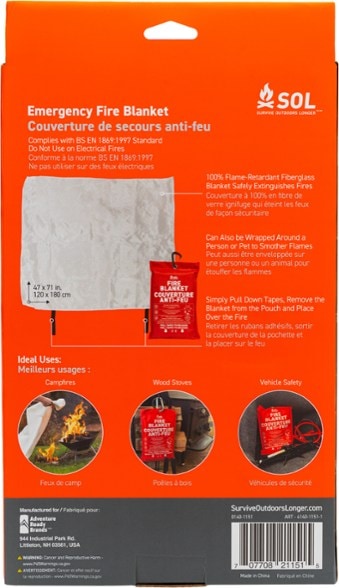 Keep this SOL Emergency Fire Blanket ready at a moment's notice in your home, your car and at your campsite. Made from 100% fiberglass, it's suitable for use on liquid, grease and biofuel fires.
