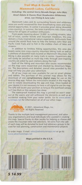 Explore part of the eastern Sierra and its alpine lakes on foot, bike or horse with help from this detailed, easy-to-read Adventure Maps Mammoth Lakes trail map complete with a matching digital copy.