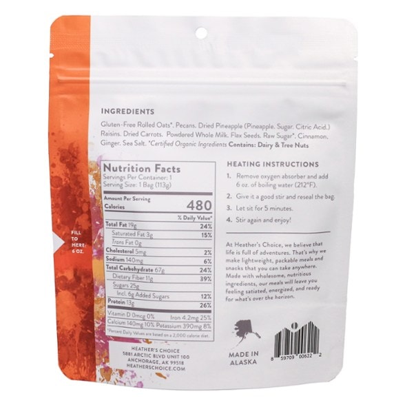 This Morning Glory Oatmeal from Heather’s Choice is delicious! It tasted amazing, the oats cooked perfectly following the packaging directions, and it’s very easy to make. You just add boiling water straight to the bag, but I wish there was a fill line on the inside of the bag. It calls for 6 ounces of boiling water, or 3/4 cup, but if you don’t have a way to measure just cover completely with water and then some. Only other thing I noticed was package says to let sit for 5 min, I had to let sit for about 10 minutes to get to a consistency I preferred. The packaging was sturdy, great for preparing on the trail or at camp! And you can’t beat these ingredients, very tasty and definitely recommend!
