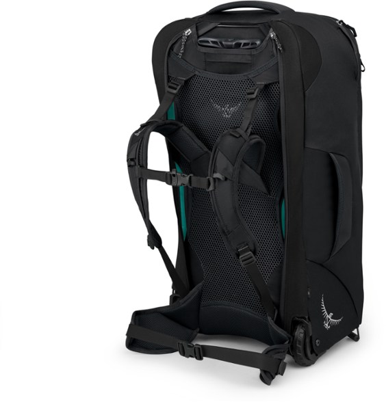 When the path forward gets rough, the women's Osprey Farpoint 65 wheeled travel pack lets you decide between using the energy-saving wheels or the capable, lightweight backpack suspension.