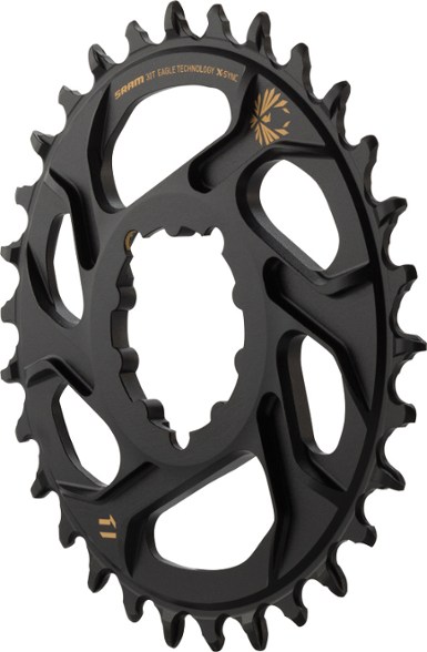 Based on intense study of chain and chainring wear patterns, the black and gold SRAM X-SYNC 2 Direct Mount chainring's radical tooth profile lasts longer, runs quieter and improves chain retention.