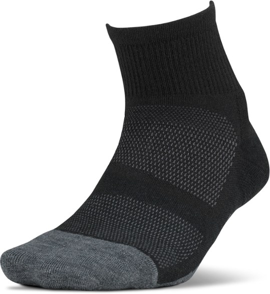 Updated with reinforced toes and heels, these Feetures Merino 10 Cushion Quarter socks provide insulating warmth when the puddles are calling.
