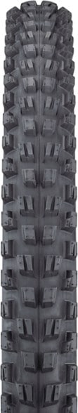 - Center lugs are tall, angular and ramped in the front to keep rolling resistance low; a flat side on the back boosts braking traction