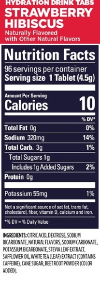 - Each tablet contains 10 calories, in addition to 320 mg of sodium and 55 mg of potassium, to help maintain fluid balance by replacing electrolytes depleted during exercise