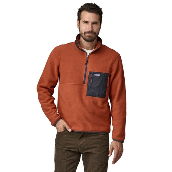 - Half-zip fleece pullover with zip-through stand-up collar for warmth; exterior of collar is trimmed with recycled nylon from the Houdini family for added wind protection