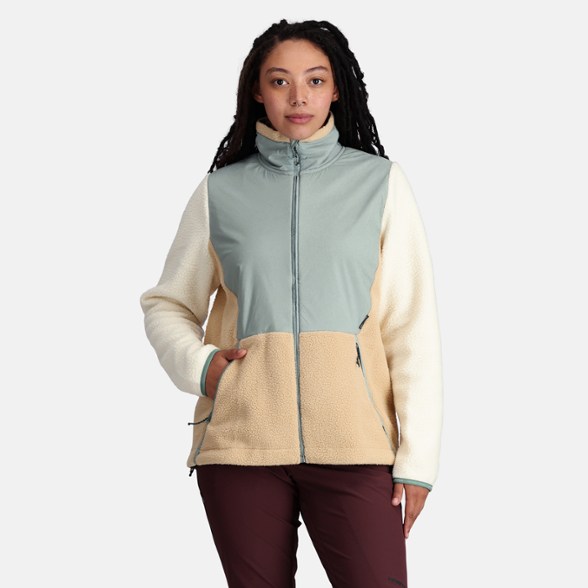 Designed to block the gusts, the women's Kari Traa Rothe Windbreaker fleece jacket keeps you comfy with its high-pile fleece and mix of fabrics that give it a patchwork look.