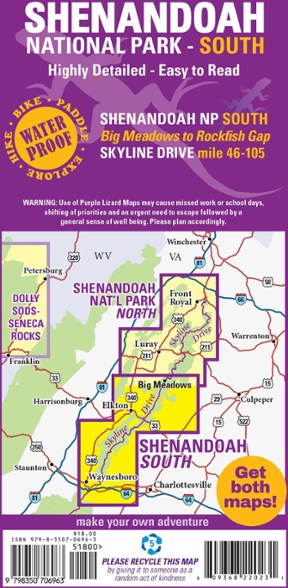 Take your on-trail exploration to the next level. The Purple Lizard Maps Shenandoah National Park: South offers a comprehensive guide to the park, Shenandoah Valley and the surrounding mountains.