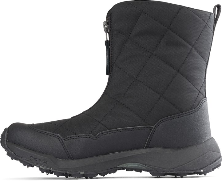 I received these products for free from the REI Trailblazers sampling program in exchange for my honest review. I haven't had a chance to try these on ice yet since I received them in September but they are warm and very lightweight. I sized up to wear with heavy socks and they seem to fit true to size. I'm sure they will be very sure-footed with the studded sole and I'm looking forward to both hiking and running errands in the winter. They are the lightest warm boots I've ever had. The zipper is sturdy and the loop at the back makes them easy to get on or off. The studded sole feels ok on a bare floor - I was concerned about wearing them indoors but I think it will be fine.