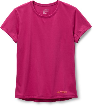 This is a good technical shirt for high output activities. The seams are nicely flat-locked, the material is breathable, and the fit is breezy without being baggy. It dries fast. I like wearing fun colors trail running, and the magenta and orange with the Arc'teryx fossil logo is great. My only improvement is that the fossil logo is on the back and you can't see it with a hydration vest or backpack. (size petite 6, wearing W's medium)