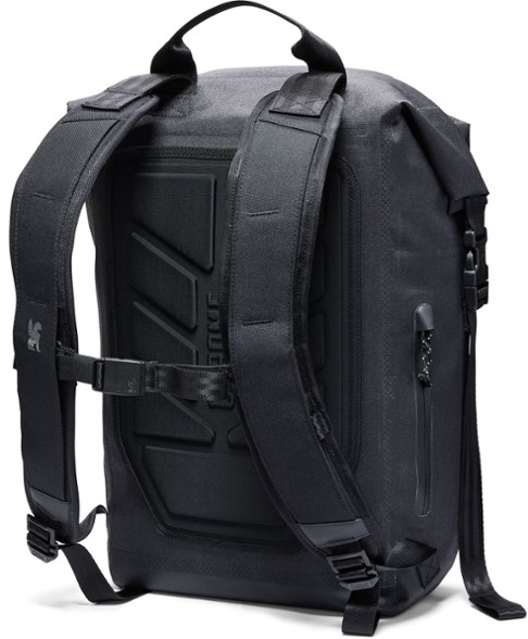 - Gear capacity: 20–25 liters; compression straps on the side can be tightened or loosened to accommodate differing load sizes depending on the number of times the top is rolled