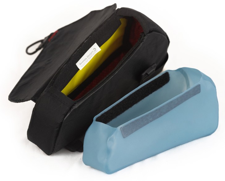 A new twist on a top tube bag, the Revelate Designs Mag-Tank top tube bag does away with a zipper and instead features a contoured top flap secured by a magnetic buckle to keep the bag closed.