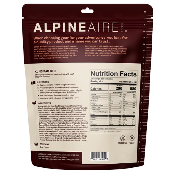 A great-tasting, nutritious meal made from high-quality ingredients, AlpineAire Foods Kung Pao Beef fuels your adventure with a bold, spicy and sweet sauce paired with beef, peppers, peanuts and rice.