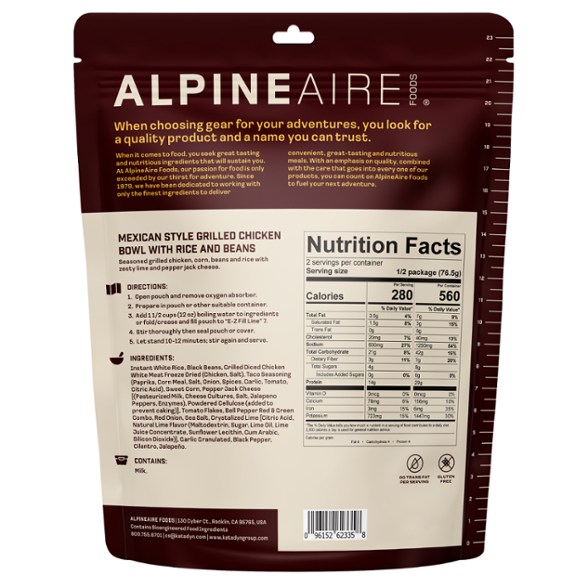 A tasty meal with quality ingredients, AlpineAire Foods Mexican Style Grilled Chicken Bowl fuels your adventure with seasoned chicken, corn, beans and rice with zesty lime and pepper jack cheese.