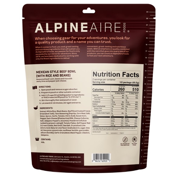 A nutritious meal made from high-quality ingredients, AlpineAire Foods Mexican0Style Beef Bowl fuels your adventure seasoned beef, corn, beans and rice with zesty lime and pepper jack cheese