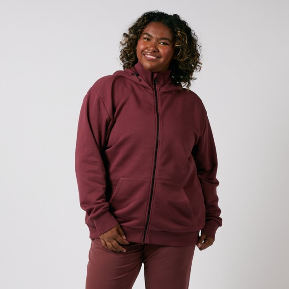 Love the length--closer to hip- than to waist-length--and the standup collar that can give it extra a little extra warmth whether or not the hood is up. And the fabric seems good-quality, but it lacks the cozy fuzziness inside that I associate with a sweatshirt or sweatshirt-adjacent garment.