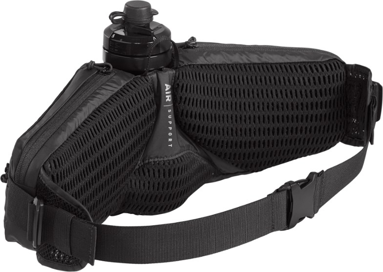 - Included 21 fl. oz. Podium Dirt Series water bottle is centered in the middle of the belt for easy access with either arm