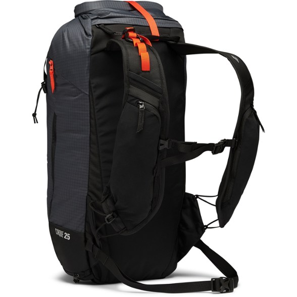 the search for a 20ish liter ski touring/ski mountaineering pack is getting closer to completion. This pack has most of the features that I was hoping for - roll top, side zipper access, separate avy tool/skin pocket, running vest style backpack straps with soft flask storage, and ice tool attachments. unfortunately, I have no idea why the attachment of the vest straps to the pack is a weird corded design - too much loose cord, and too complicated and flimsy to make me trust it. the pack is also on the large side for a 25L pack. Ideally it would be closer to 20 than whatever this measures out too - too similar to my 30ish liter packs to make it worthwhile for me. unfortunately, I returned. but i like the idea and concept and hope that BD refines this pack one more iteration for next season.