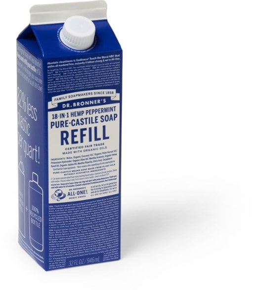 Refill your bottles from this 32 fl. oz. carton of Dr. Bronner's 18-in-1 Pure-Castile soap. It's a plant-based, multisurface all-purpose cleaner you can use for your body, home, camping and more!