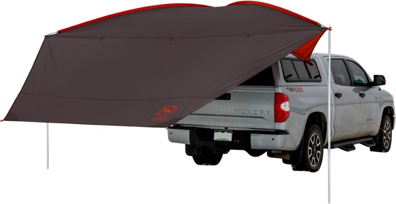 I have been a dedicated Yakima rack user for many years and initially intended to install the SlimShady awning. While permanently mounted awnings look slick and are instantly deployable, you have to factor the awning into how you park. The Sand Wash Car Tarp offers so much more versatility, responding easily to the direction of my vehicle, the elements, and available space. My truck happens to have a pair of crossbars over the cab and another pair on the camper shell. I can mount it on either set of bars, and on either the passenger or driver's side. I can even mount it on the rearmost crossbar and over the tailgate. Similarly, it is easily tossed into my wife's car at a moment's notice when it makes sense to take her car. I could see the extended flap being useful against blowing rain or angled against the late afternoon sun. However, I purchased two lightweight extendable poles from another online retailer to hold up the extended flap, which offered a massive amount of additional shaded real estate. If you are handy with tarp set up and tying guy lines, this tarp could also be used free standing, provided you have proper supports and guy lines for each of the corners. Its removability also means that I don't have to worry about theft or mother nature damaging it when not in use. My only quibbles: the shockcorded tent poles which create the raised dome go in easily enough, but as all shock cords deteriorate and become slack, care must be taken to PUSH the poles out when disassembling rather than pulling them out. Additionally, the aluminum tent stakes are trash. Buy some extras to have on hand for when you inevitably bend them. I can't say enough good things about the Big Agnes Sand Wash Car Tarp. Easily one of my favorite car camping gear purchases this year. We look forward to using it for years to come.