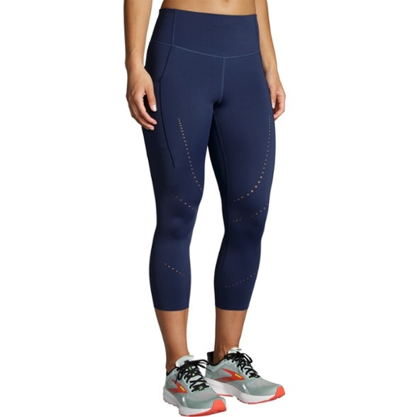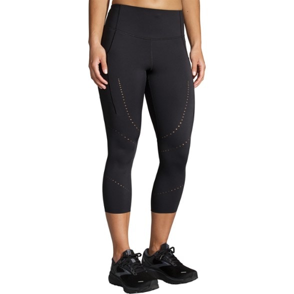 As smooth as they are supportive, the women's Brooks Method 3/4 tights have a lightweight feel and strategic perforations for better breathability while you flow from sun salutations to Savasana.