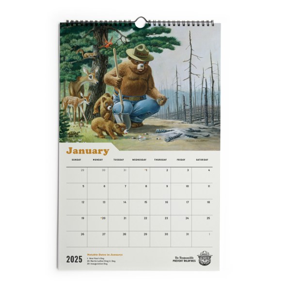 Enjoy the enduring legacy of Smokey Bear with the 2025 Smokey Bear Calendar from The Landmark Project. It features authentic vintage artwork by Rudy Wendelin.