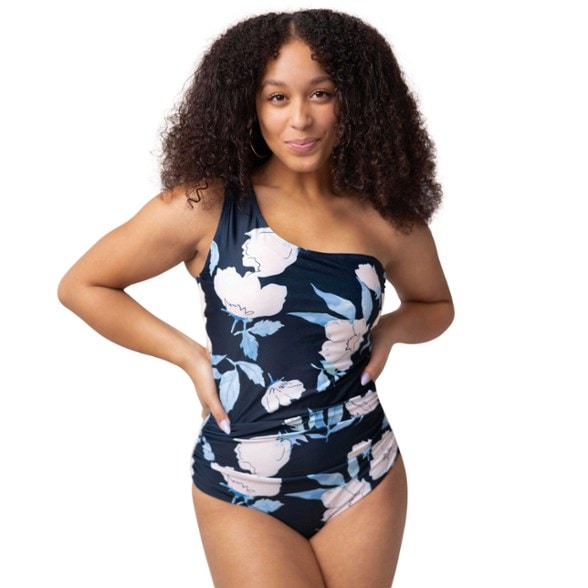 A one-shoulder silhouette with a wide strap and side ruching, the women's Nani Swimwear Cascade one-piece swimsuit balances elegant style with coverage and support.