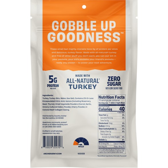 A tasty, savory and wholesome snack, the Country Archer Jerky Co. All-Natural Turkey Mini Sticks are a perfect bite of protein whether you're at home, in the backcountry or on the go.