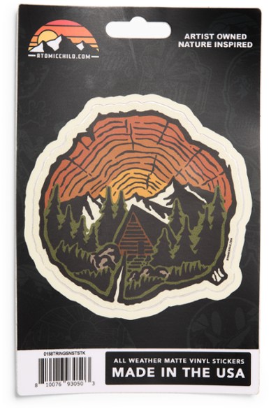 Turn your laptop, car or water bottle into art with the addition of this Atomicchild Tree Rings Sunset sticker. It brings together some of the best of nature—trees, cabins and sunsets.