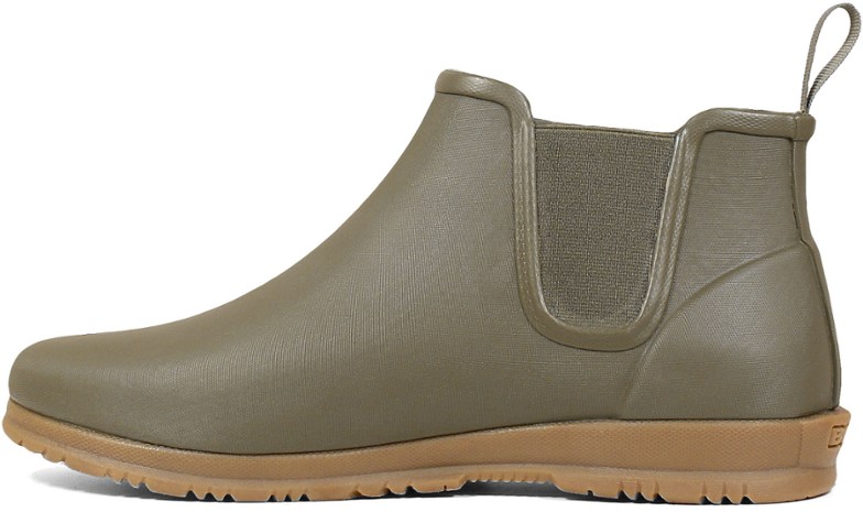 This is my second pair of Bogs Sweetpea Winter Chelsea boots. They are warm and very comfortable. I originally bought a black pair after having a hip replaced and needing a shoe that was easy to get on and off. I liked them so well I decided to get them in the sage green. They are very stylish and look great with jeans and skirts. I have always liked Bogs because they are waterproof and easy to keep clean. Fit is perfect, buy your regular size. A heavy sock might require a half size larger for some, but because the boot is a softer material I don't think it is necessary. Just a very cute boot at a very reasonable price!