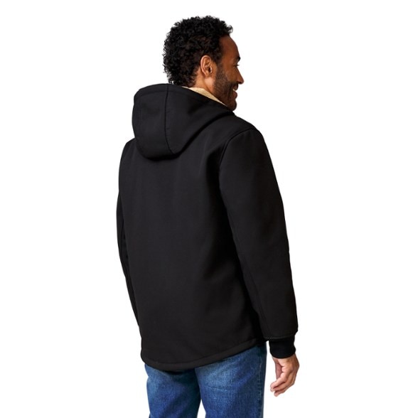 A soft shell that works as hard as you do, the Free Country Hooded jacket's durable canvas soft-shell material fights off wind and rain, while a lofty sherpa fleece lining retains warmth and comfort.