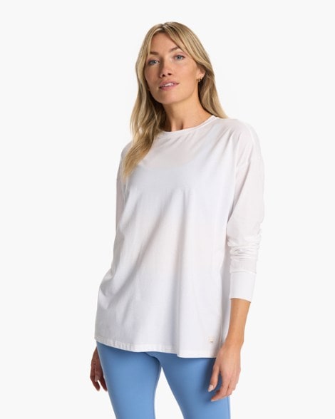 Lightweight and relaxed, the women's Vuori Long-Sleeve Feather T-shirt barely weighs a thing yet provides surprisingly great coverage when you're out and about.