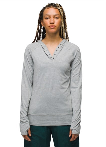 No matter how long you're planning to be outdoors, this soft jersey prAna Sol Searcher women's hoodie is made to keep you comfortable with its wicking fabric and sun safe with its UPF 50+ protection.