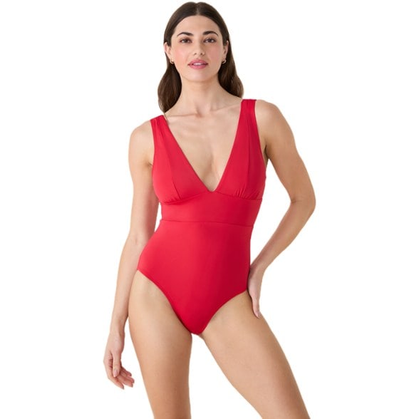 Contoured seams and a plunging V-neckline turn up the timeless style of The Mykonos women's one-piece swimsuit from Andie. A sculpted fit and medium bust support keep it practical for travel.