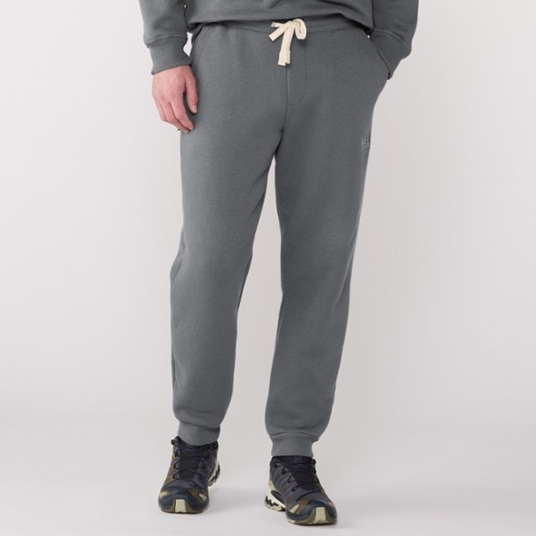 A cotton/polyester blend, warm brushed inner fleece and ribbed cuffs make the REI Co-op Logo sweatpants cozy enough to log some hours in the car or by the campfire.