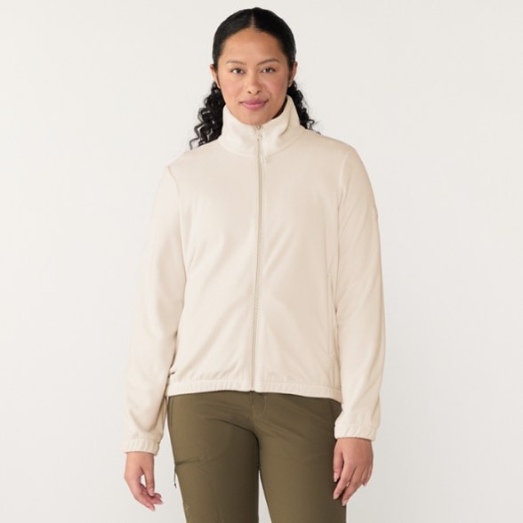 This could have been a great fleece jacket except for the bottom elastic. Don't be fooled by the photos. The elastic hugs the hips and any movement whatsoever causes the jacket to ride up. The men's version does not have the bottom elastic, so why put it on the women's? This may work if you're tall and skinny, but if you have any hip definition (and most women do), good luck with it. Also, for the price, they could have put in zippered pockets.