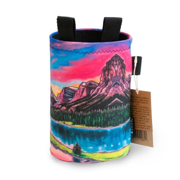 About the artist: Rachel Pohl is an artist, writer and athlete from Montana who calls the arctic of Norway home. Her vibrant oil and acrylic paintings capture the feeling of awe and joy we experience in nature, inspiring us to connect with and advocate for wild places. Bring a piece of the mountains with you wherever you climb with this Spirit Island Jasper National Park chalk bag.