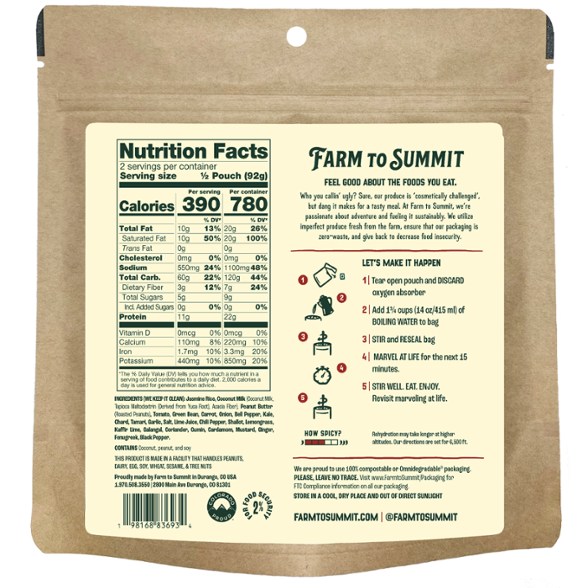 Love this company and all their meals! Flavor, large amount of a variety of veggies, and quality make these meals a major standout compared to all other backpacking freeze dried options. Thai Red Curry is delicious, as are all the other Farm to Summit meals I've tried. Thank you to all stores who carry them, now that I no longer live by Durango where they were more readily available to purchase locally.