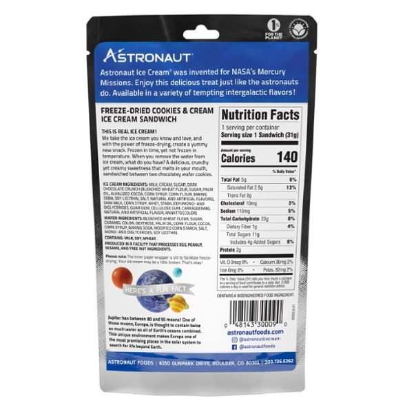 An out-of-this-world treat for space travel or backpacking, the Backpacker's Pantry Astronaut Cookies & Cream Ice Cream Sandwich features freeze-dried ice cream sandwiched between 2 chocolate wafers.