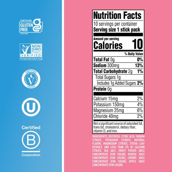 Pink Lemonade ingredients: Dextrose, citric acid, sodium citrate, potassium citrate, natural flavor, magnesium citrate, stevia leaf extract, and less than 2% of calcium citrate, sea salt, sweet potato juice concentrate (for color), radish juice concentrate (for color), cherry juice concentrate (for color), apple juice concentrate (for color).