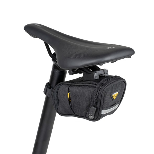 It may be small, but the Topeak Aero Wedge Pack DX is packed with features: 3 zippered compartments, a reflective strip that doubles as a taillight holder, and an easy mounting/removal system.