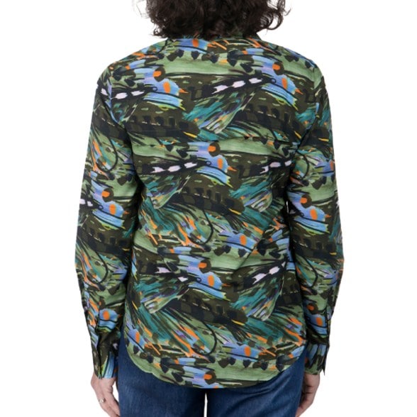 Fits well & I like the print on sleeves. Not crazy about the feel of the fabric but it is supposed to be quick drying which will be great in hot, humid climate where I plan to wear it next