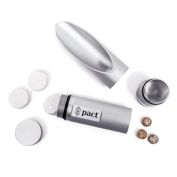 - Kit includes a durable aluminum shovel and integrated storage containers that hold enough PACT Wipes and PACT Tabs for about 3 bathroom trips