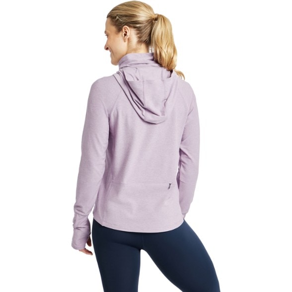 A luxurious take on a classic pullover, this Oiselle hoodie is made from luxe fabric. A built-in neck gaiter adds warmth and coverage around the face while a large back pocket maximizes storage.