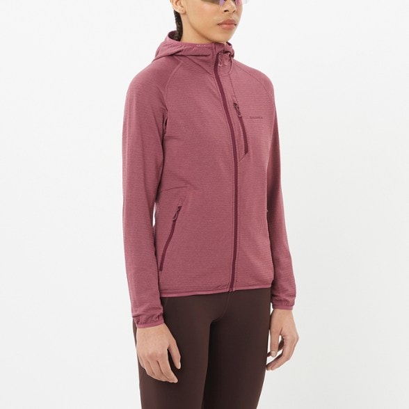 Stay comfy with this slim-fit Salomon fleece hoodie. The fabric is warm, wicks away moisture and lets air circulate. It's a great mid layer for chilly activities like trail running or XC skiing.