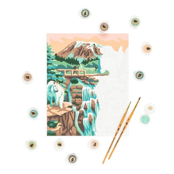 - Mount Rainier paint-by-number kit features a view of the peak featuring Myrtle Falls with a mountain goat looking on in the foreground