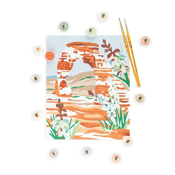 Unleash your inner artist with this Elle Cree paint-by-number kit. It depicts Delicate Arch surrounded by yucca plants in bloom—one of which hides a tiny plateau fence lizard.